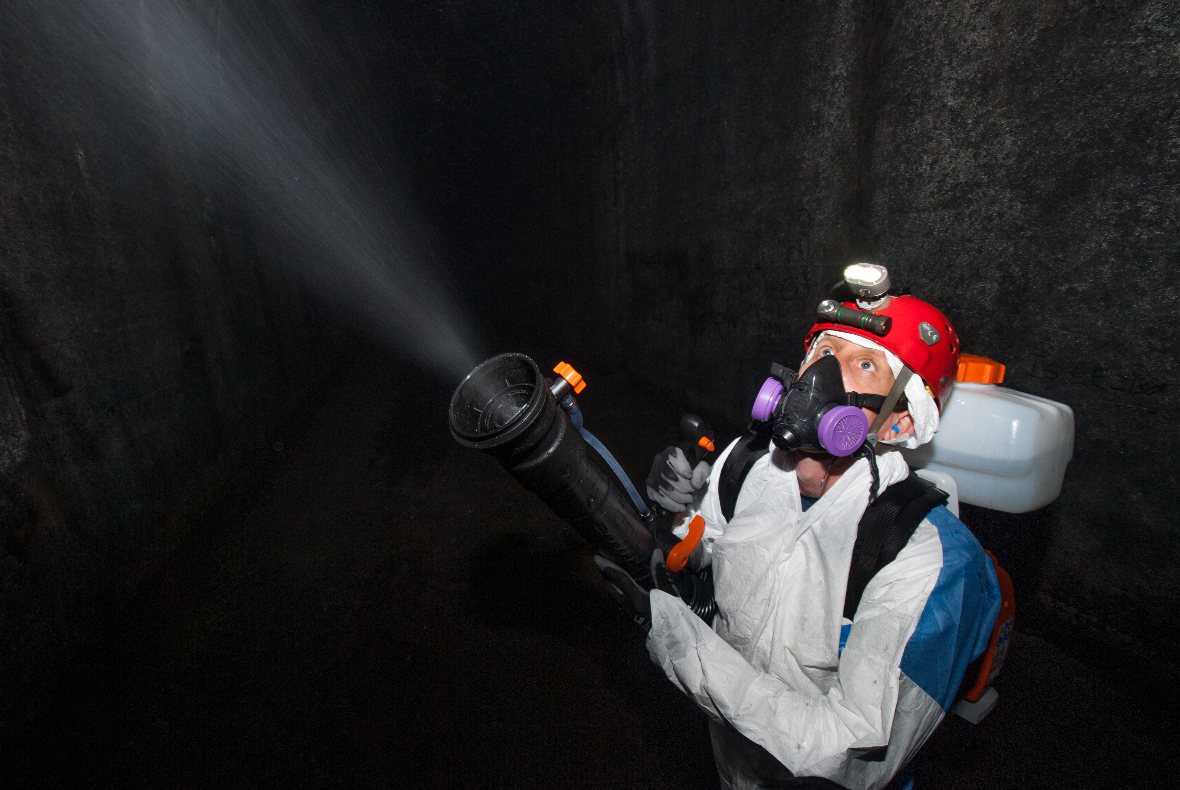 “We’re not treating the bats — we’re trying to lower the environmental reservoir of the pathogen,” Overton says. “Just like you do in an agricultural setting, because you can’t stop wind from blowing in a pathogen from a neighboring farm that didn’t spray.”