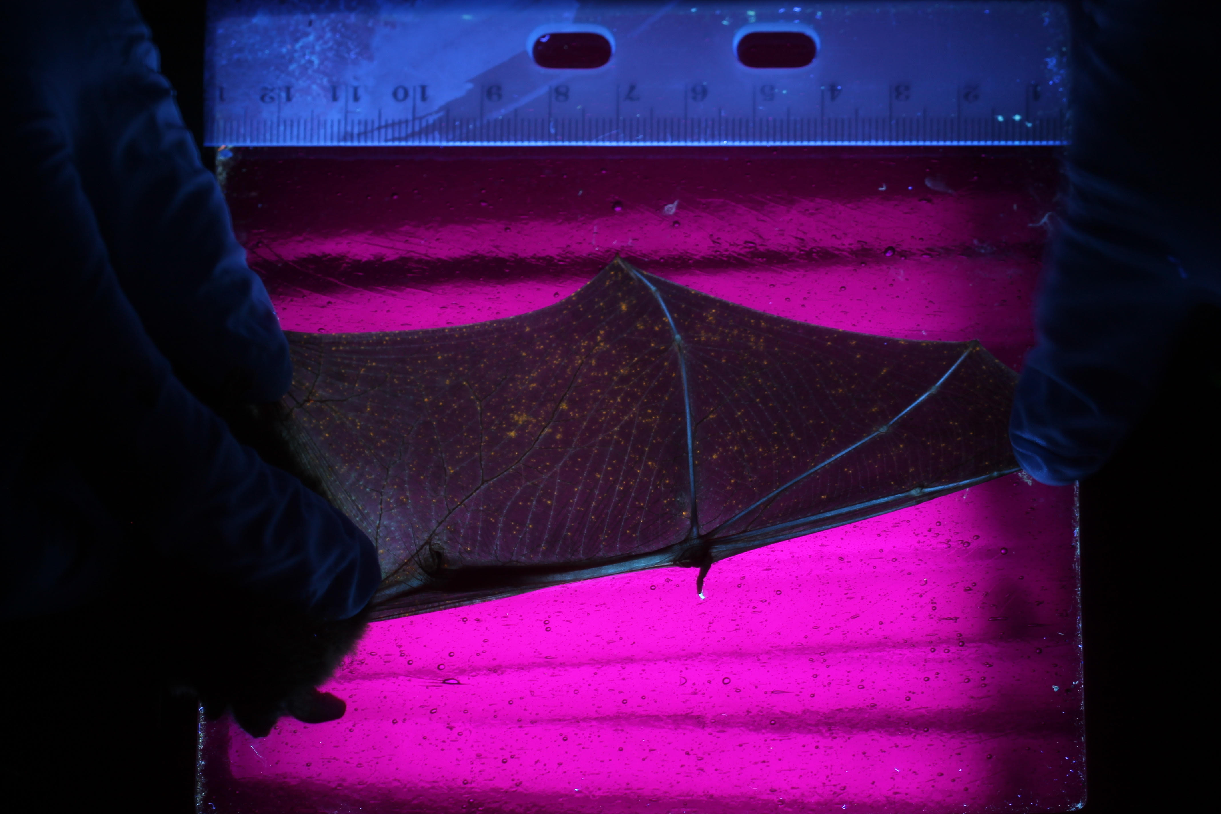Sewall and Turner then photograph their wings under UV light. If there is white-nose fungus on a wing, it will glow orange under the light. The orange is actually iron being pulled from the bat by a chemical secreted by the fungus.