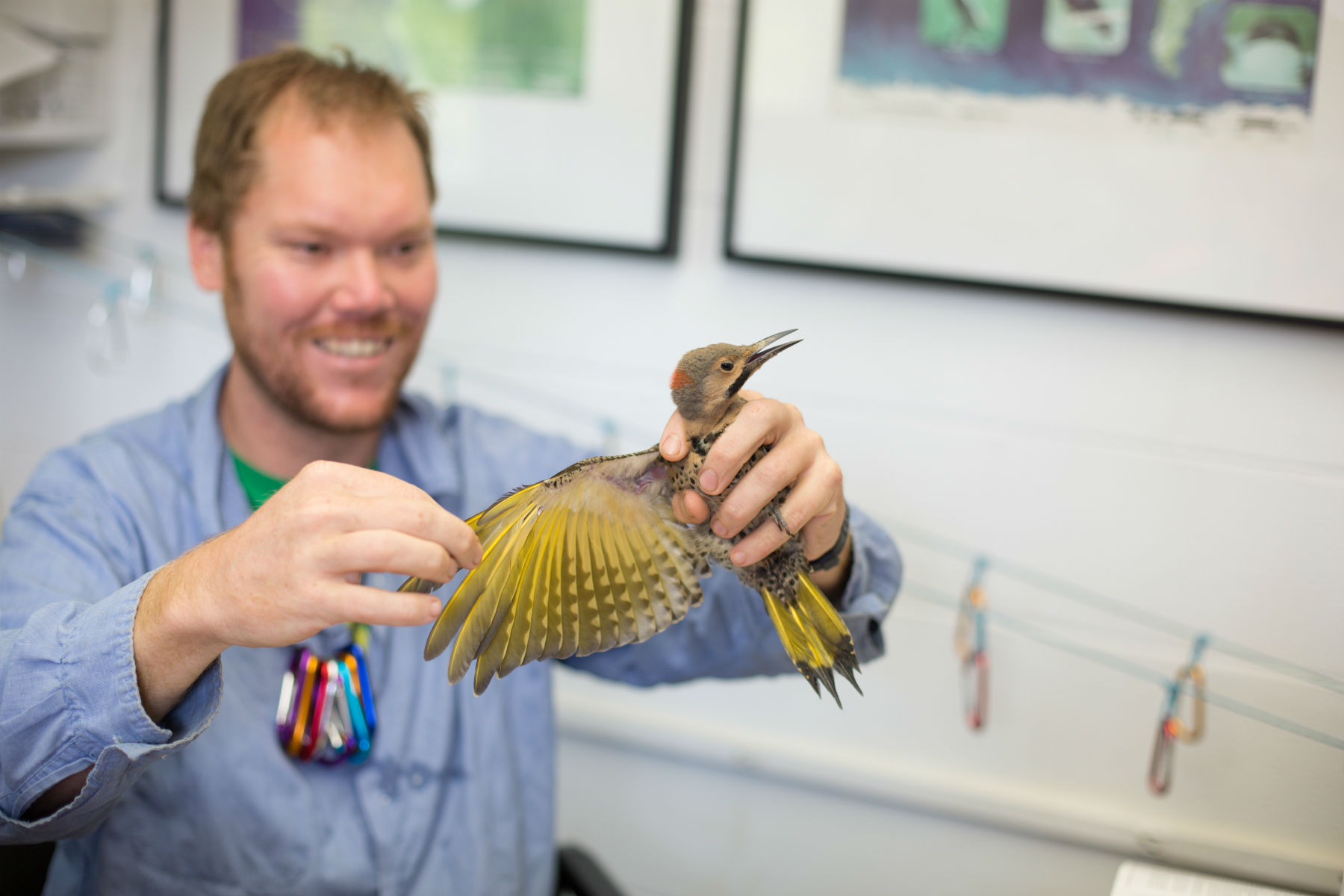 Featured Image: Ruby-throated Hummingbirds are breeding earlier and more quickly, but having fewer young than they had 50 years ago. Clockwise from top left: DeGroote carrying birds around his neck (Photo: Kara Holsopple); The Hooded Warbler, one species now having fewer chicks; DeGroote checking nets; DeGroote with a Northern Flicker. (All photos except where noted courtesy of Powdermill Nature Reserve)