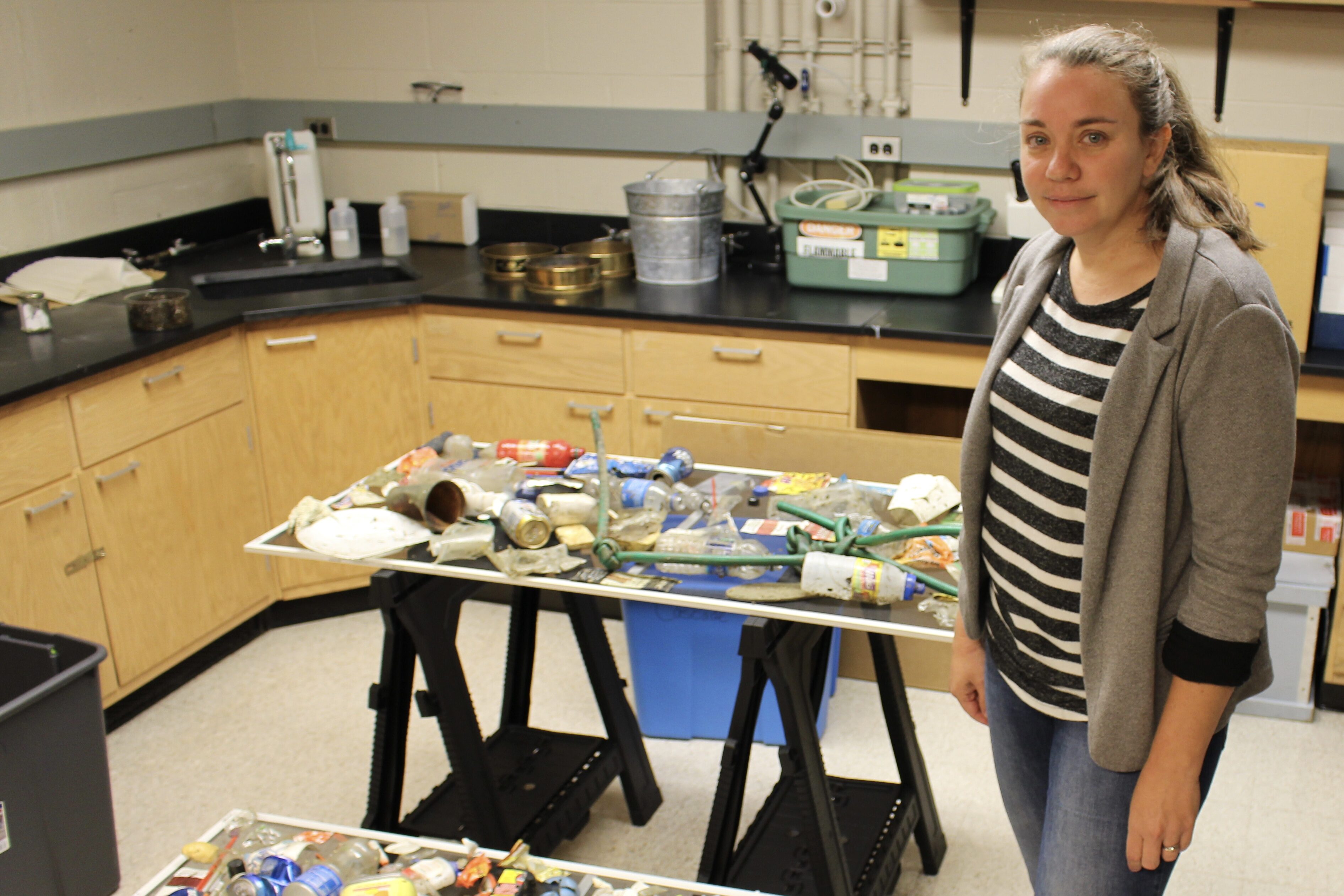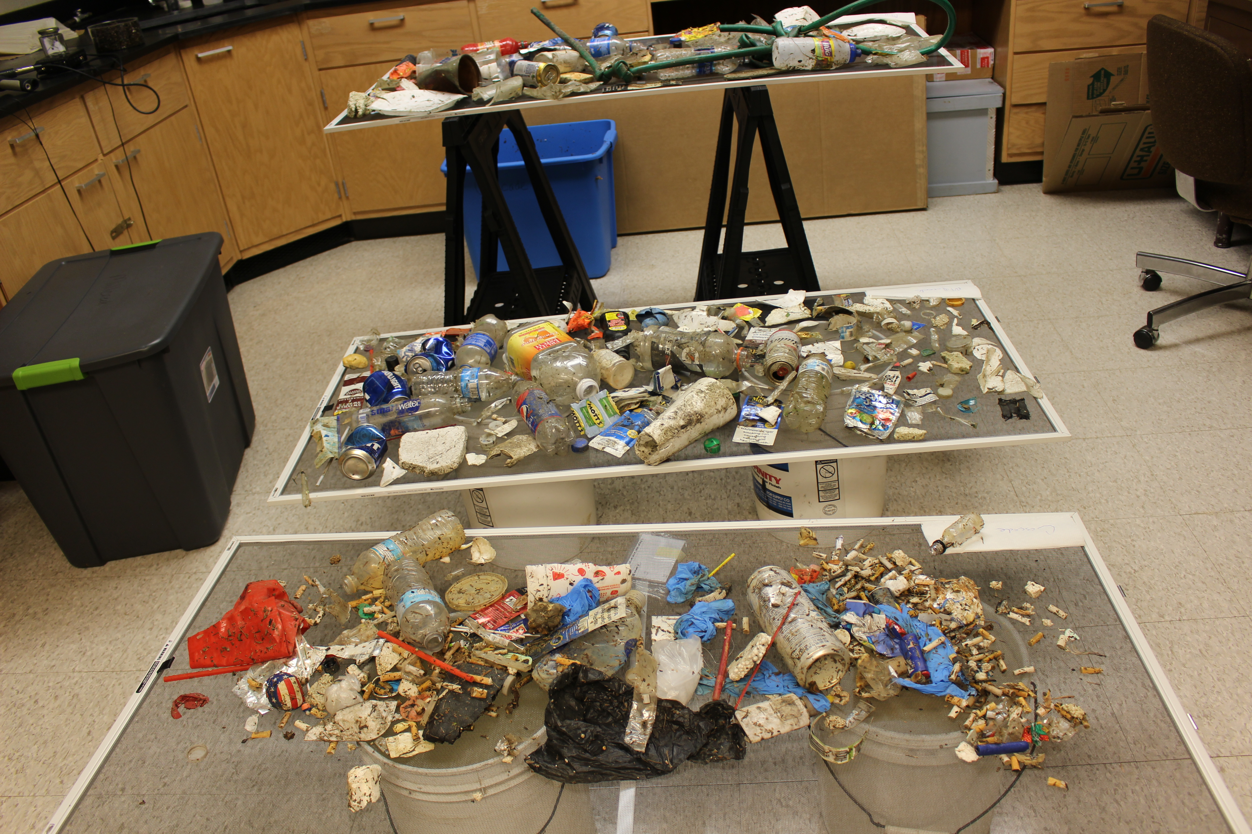 They then take their collected trash to the lab, and lay it out to dry on screens where students sort it, and input data about each piece: what product it is, the material, and the type of container.