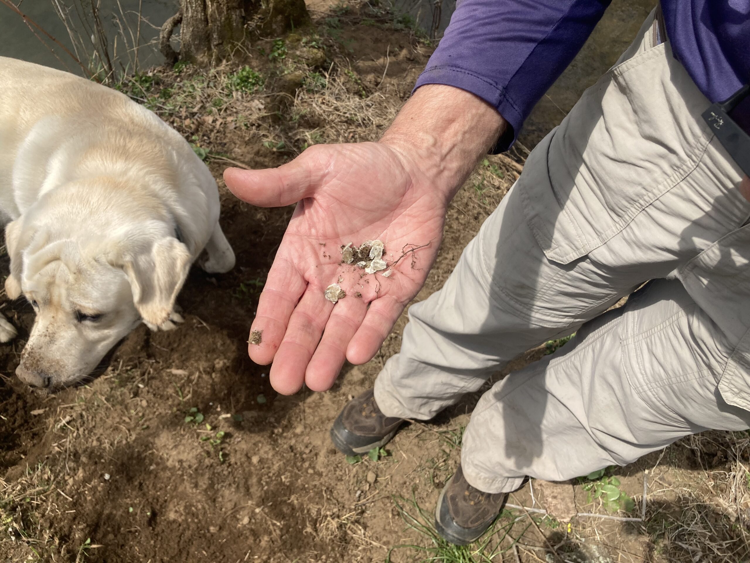 Merlin started digging around a small pile of white-colored droppings and fish scales, evidence that the site was being used as an otter latrine, which is kind of what it sounds like: a bathroom.